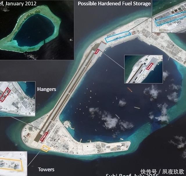 永暑礁的变化最让人惊叹,2014年刚开工时,这儿还只是个涨潮时大半被淹的礁盘。 到2016年,它已经扩展到2.74平方公里,岛上修起了3125米的跑道,飞机能稳稳起降,港口、雷达站也一应俱全,活脱脱一个海上小城。