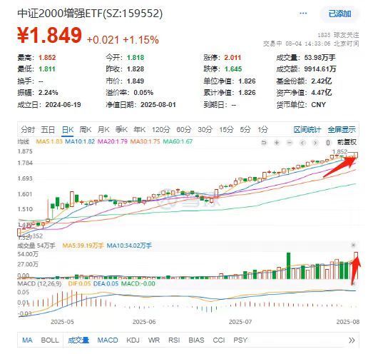 8月4日,中小盘大放异彩。截至14时31分,规模最大的的中证2000增强ETF(159552)涨1.20%,近5日涨0.82%,近10日涨3.12%景盛配资,近20日涨8.95%,今年以来累计涨41.98%;盘中创年内第34次新高;交投持续升温,换手率达21.91%,成交额约9700万创近一年新高,环比前日放量近6成;资金热度不减,据Wind Level2实时行情结合均价预估,盘中净流入约5500万,以实时成交价估算,盘中预估规模超5亿再创历史新高。