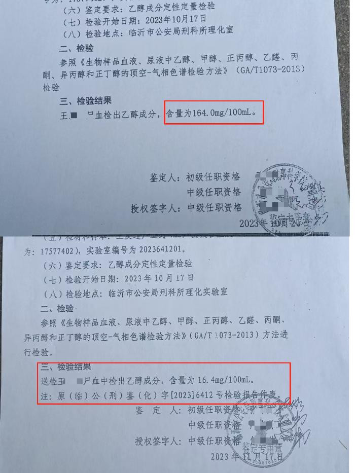 王先生告诉记者,事后他便拿着这份报告去平邑县交警部门讨要说法。王先生称,当时肇事科一名工作人员又拿出另一份报告,其中尸血检测中乙醇含量为16.4mg/100ml,“他们就是说工作人员录入时点错了一个小数点。”