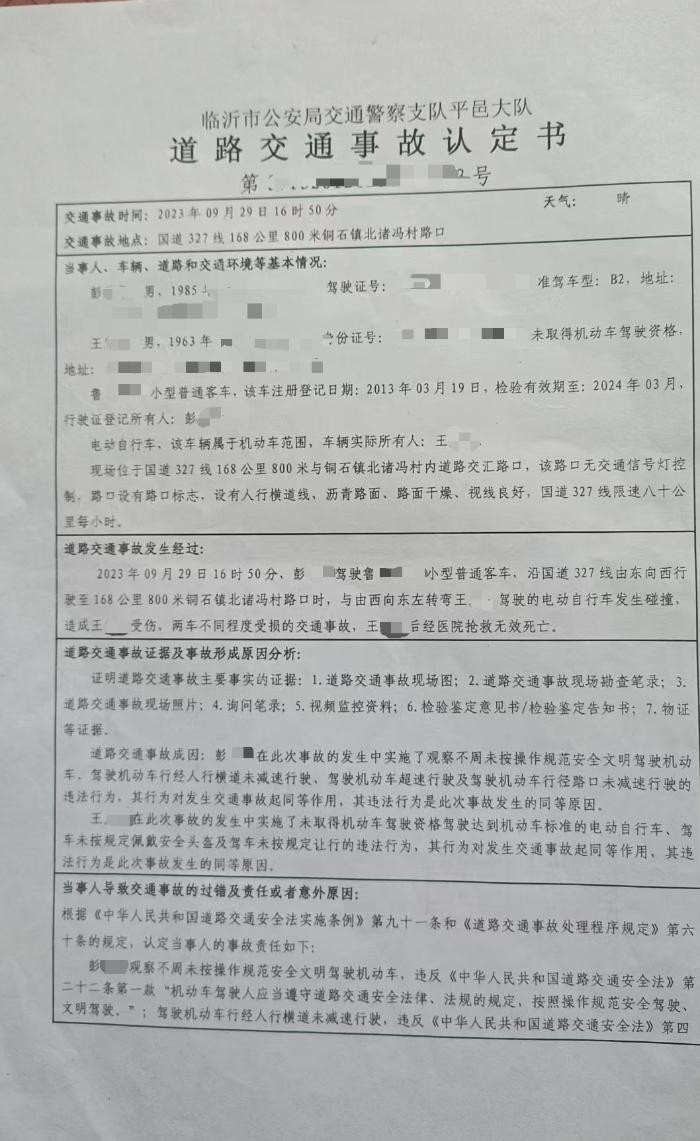 2023年9月29日,王先生的父亲在大队里帮忙干活,结束后便骑着一辆两轮电动车准备回家,而悲剧也在此时发生,当其父亲沿国道骑行至铜石镇北诸冯村路口时,与一辆小型客车发生事故,而王先生的父亲也在送医抢救无效后死亡。