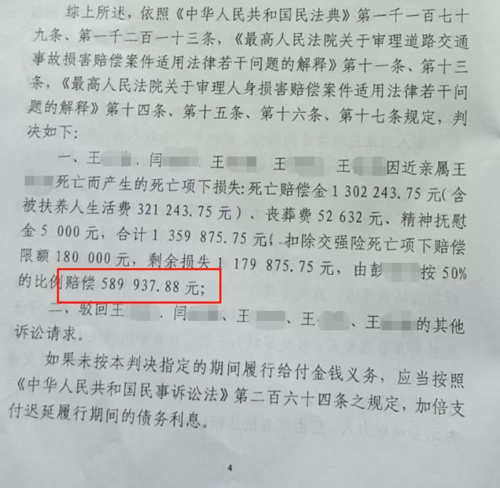 随后,王先生向记者提供了平邑县人民法院于2024年6月20日对该起交通事故做出的民事判决书,判决对方按50%的比例赔偿58万余元。